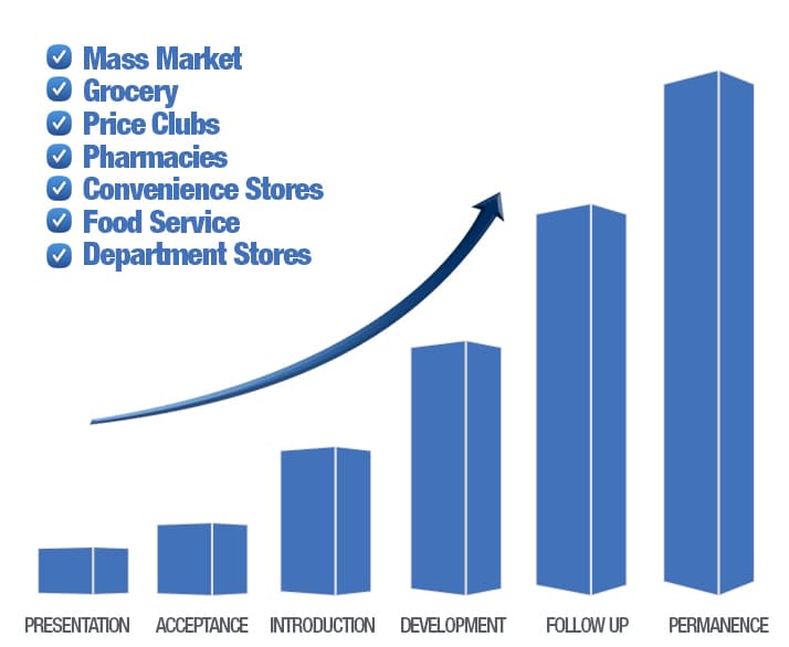 Thru sales force, promotion and public relations, our outstanding team 'pushes' your product into trading channels and stores .